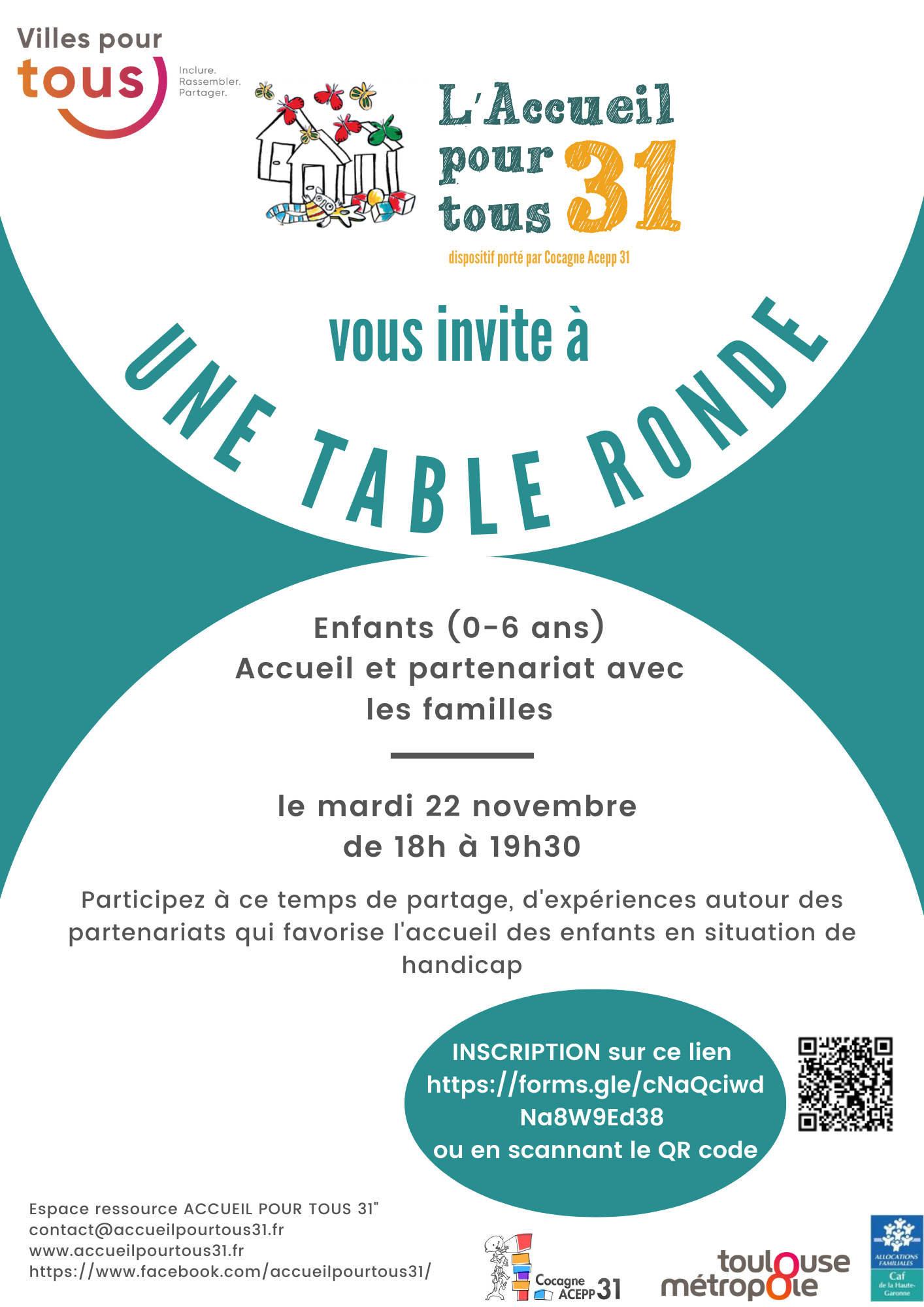 17 NOV Table ronde Ville Pour Tous – Enfants (0-6 ans) Accueil et partenariat avec les familles Participez à ce temps de partage, d’expériences autour des partenariats qui favorise l’accueil des enfants en situation de handicap le mardi 22 novembre de 18h à 19h30 INSCRIPTION sur ce lien https://forms.gle/LWtFuYtZBH2Hh5ey7 ou en scannant le QR code Auteur de l’article : accueil